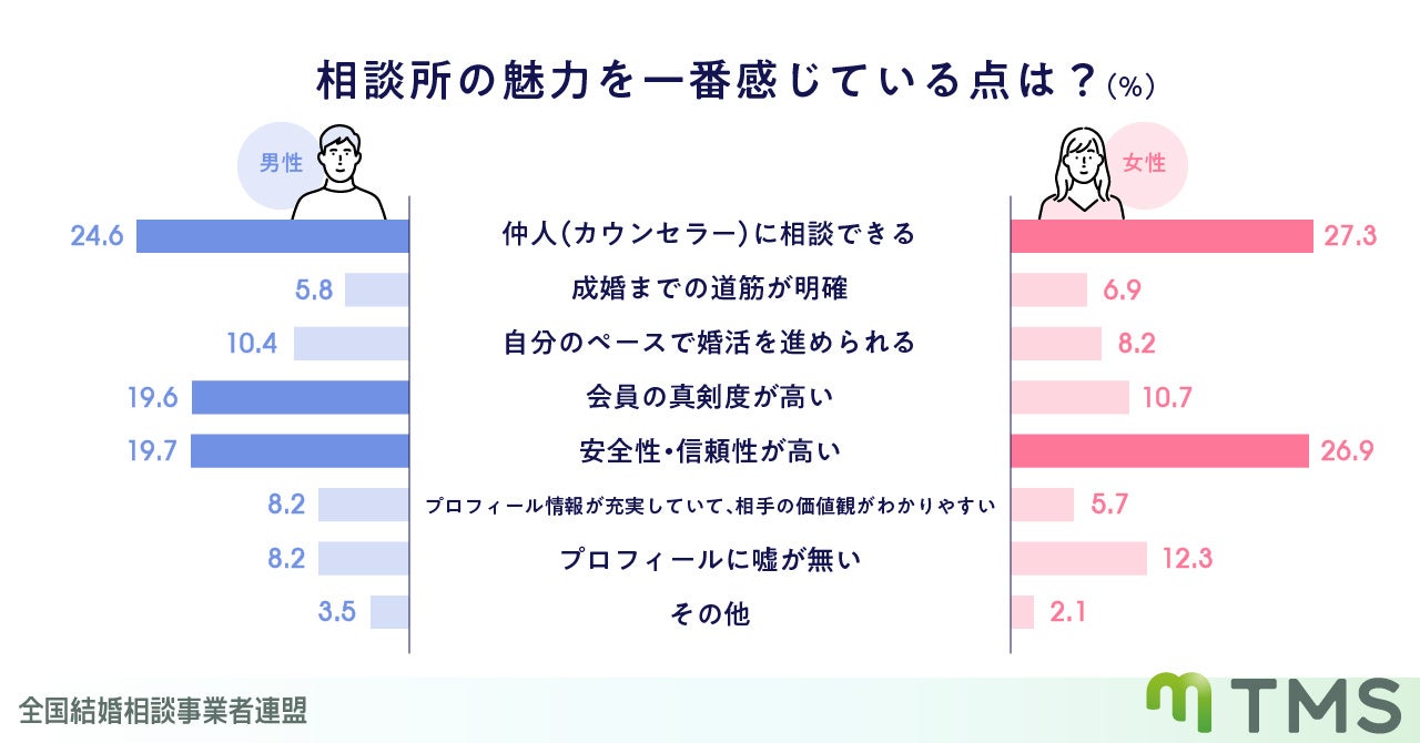 【会員に聞いた】結婚相談所の魅力は?男女ともに「仲人に相談できることが魅力」が最多回答。次いで安全性・信頼性の高さ