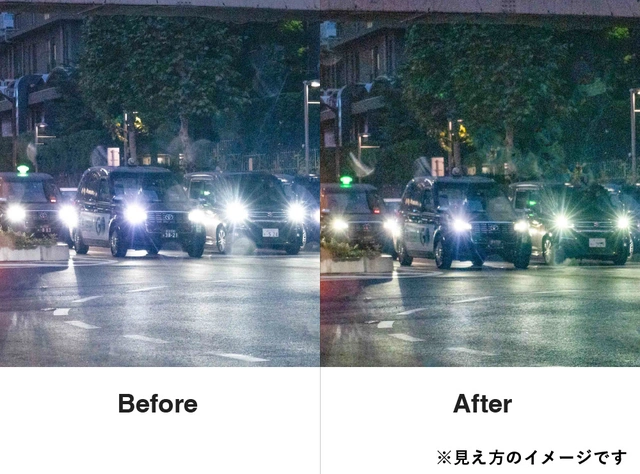 視界を暗くすることなく不快な眩しさだけを軽減し、夜でもクリアな視界をサポートします。