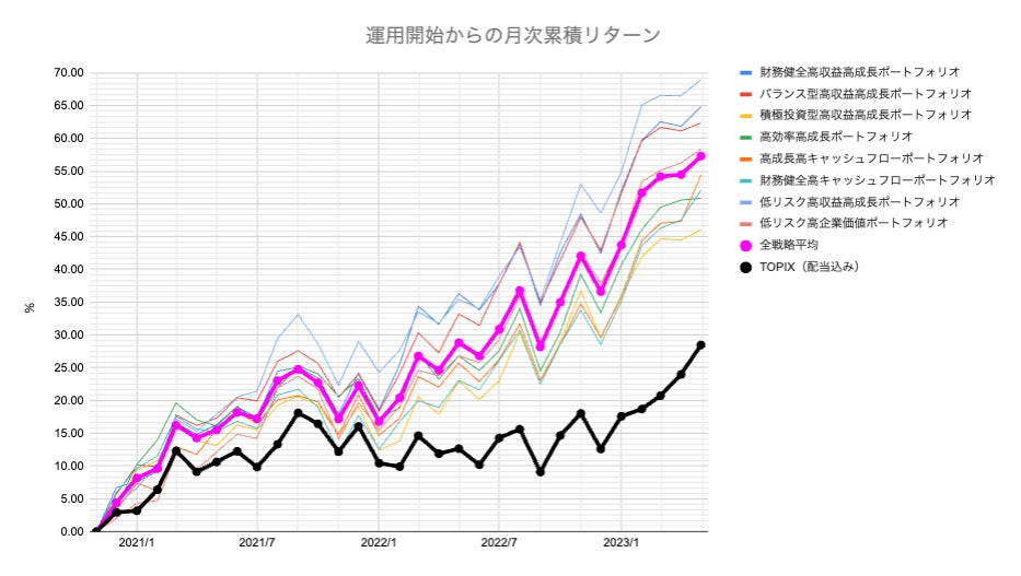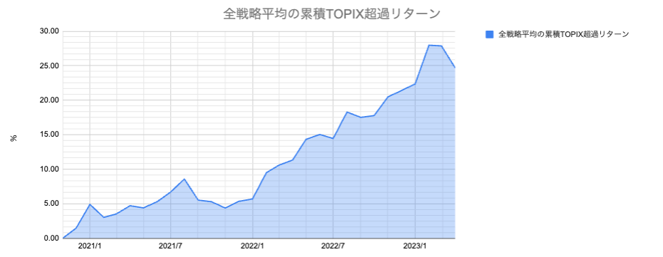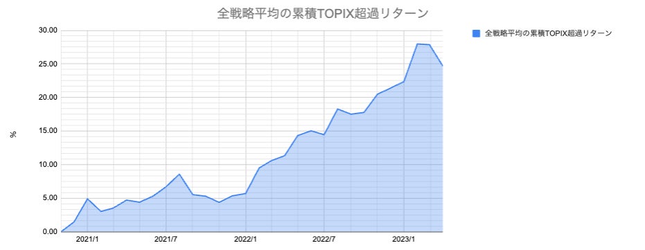 運用開始からの各戦略月次累積リターン、全戦略平均の累積TOPIX超過リターンについては下記グラフをご確認ください。