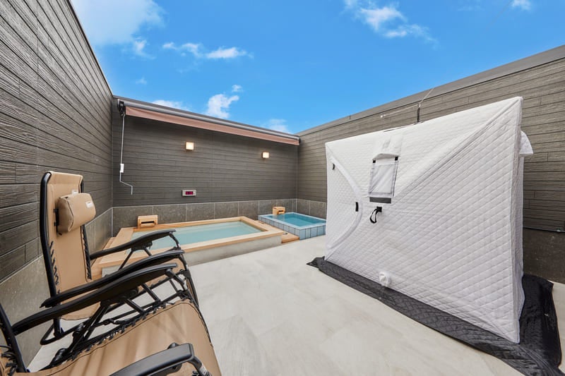 全客室に設置された専用の露天風呂にテントサウナ、そして天然水の水風呂。