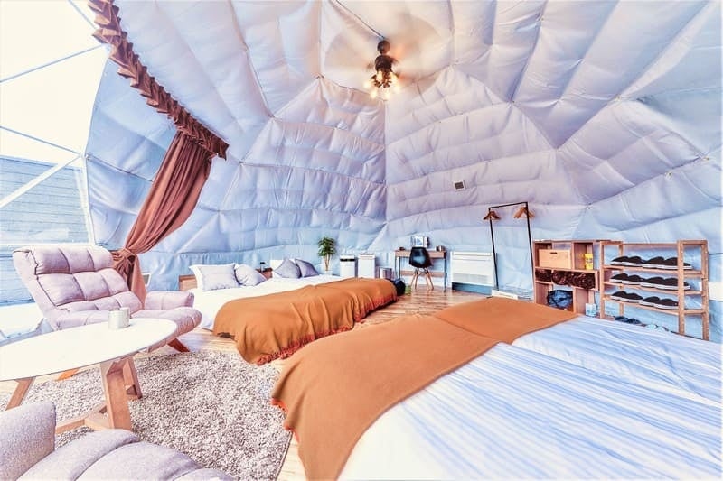 各室をそれぞれ敷居で囲い、プライベート性を重視したスペースの中に独立型のドーム型テントとハウス、露天風呂、テントサウナ、富士山の天然水を使用した水風呂を各室に設置。