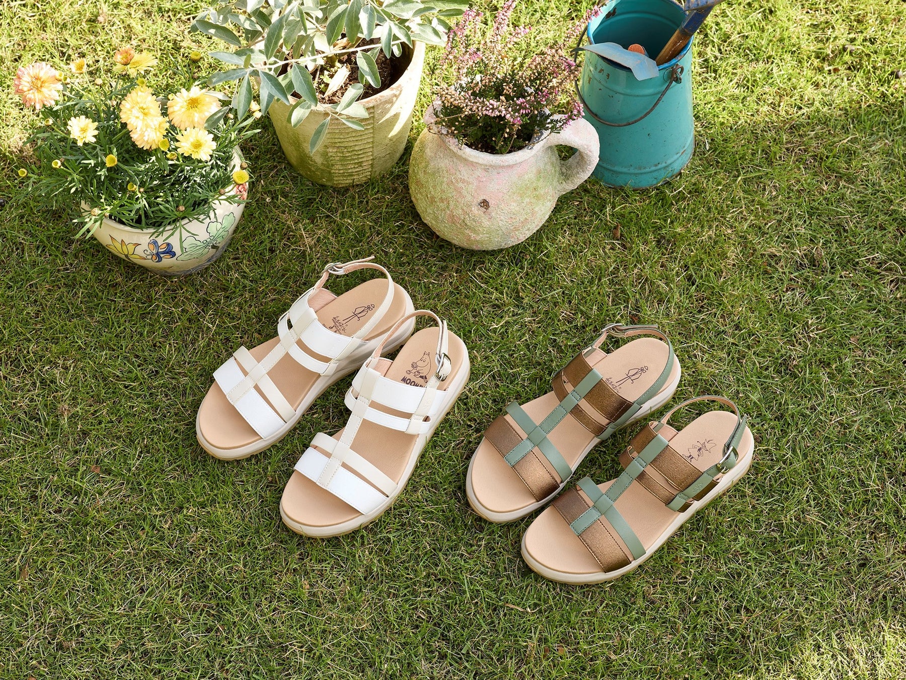 高反発クッションを使用し、足にしっかりフィットする構造で、アウトソールをスニーカー仕様とすることで、長時間履いても疲れにくい設計です。インソールやストラップ部分にさりげなくムーミンのモチーフを取り入れ、夏のお出かけにも最適で快適な履き心地です。