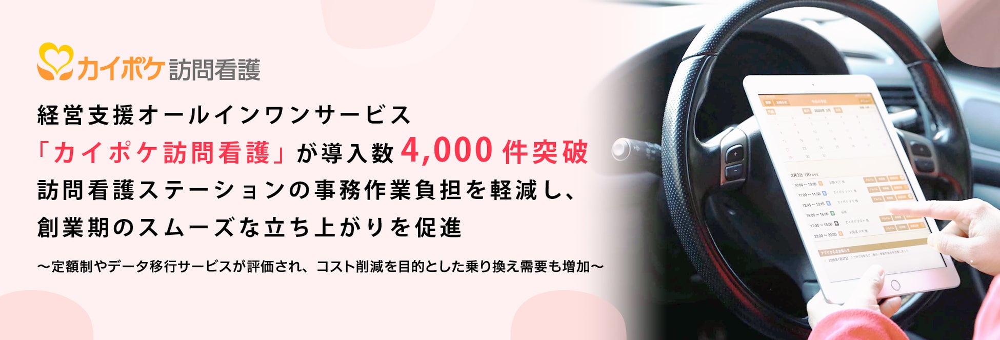 医療・介護における在宅ケアの対象者は急増しており、要となる訪問看護ステーションにはより質の高い看護の提供と業務の効率化が求められています。一方で代表者が開業準備に時間を取られたり、事業経営に悩まされたり、職員が事務作業に追われたりするなどの課題があります。これらの課題解決のために、開業支援(無料)にはじまり電子カルテからレセプト請求(月額定額制)に至るまで、幅広く経営を支援するサービスとして「カイポケ訪問看護」をご採用いただいております。今回、当サービスをご評価いただいた結果、導入数4,000件を超えたことをとてもうれしく感じております。今後も「事業所様の事務作業負担を減らし、看護業務に集中できる環境をつくること」を目的にサービスを改善し続けてまいります。