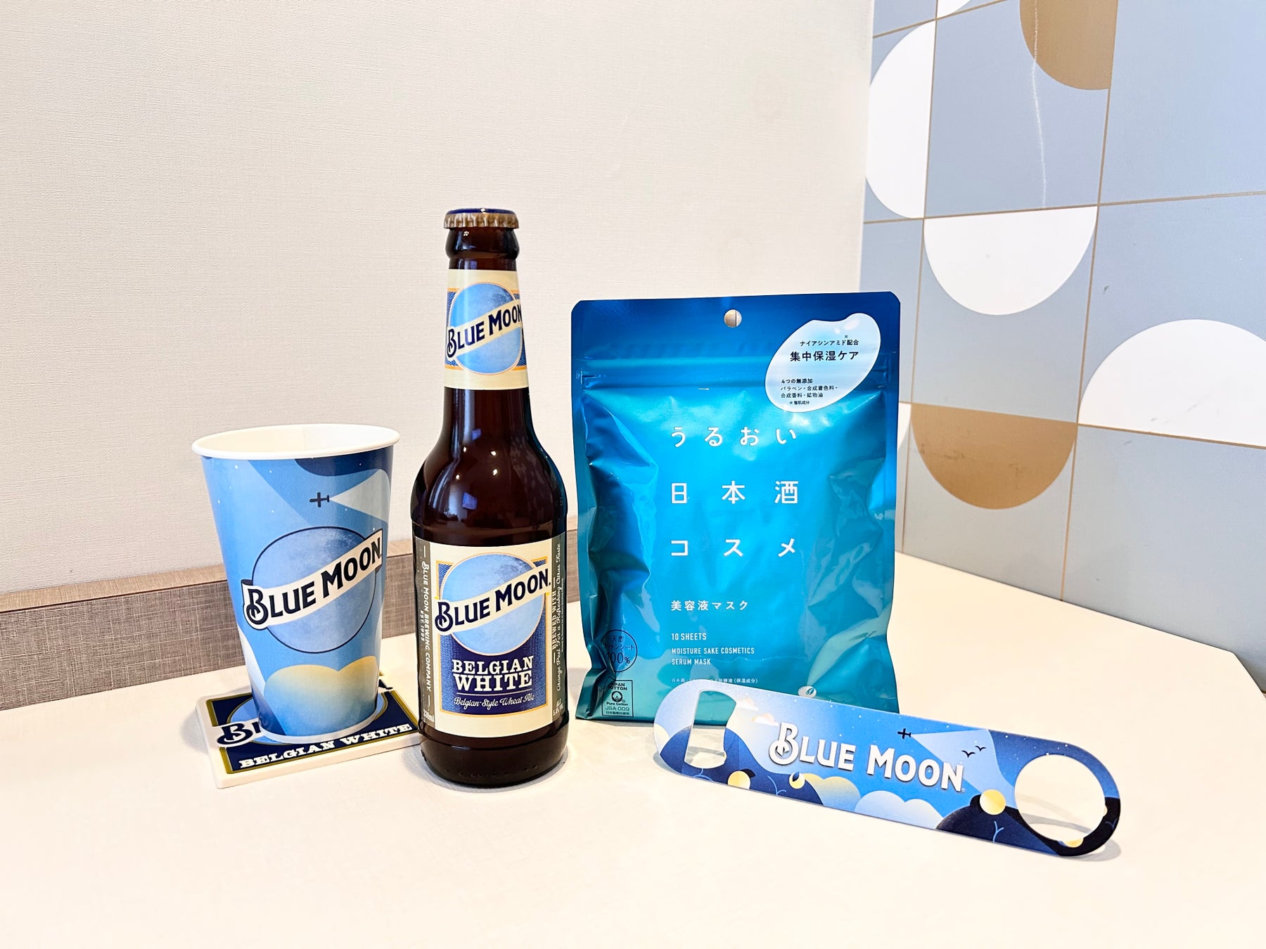 白鶴酒造が展開する、いま話題のクラフトビール「BLUE MOON」をはじめ、オリジナルオープナーも付いて、開ける瞬間からホワイトエールビールの香り豊かな風味をお楽しみいただけます。また、白鶴酒造の日本酒をふんだんに使った、お部屋でゆっくりお肌をケアできる「うるおい日本酒コスメ 美容液マスク」もプレゼントします。