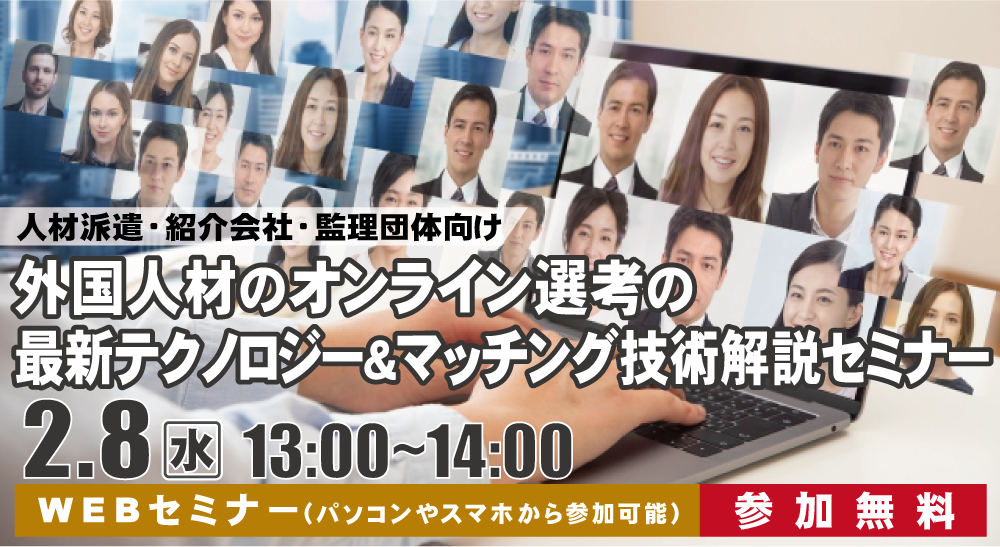 無料ウェビナー【2/8(水)13:00~】【人材派遣・紹介会社・監理団体向け】外国人材のオンライン選考の最新テクノロジー&マッチング技術解説セミナーを開催いたします