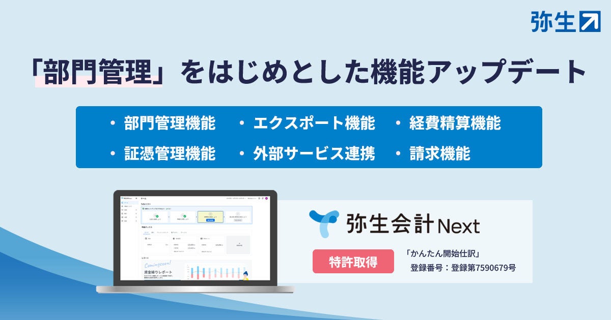 弥生株式会社(本社:東京都千代田区、代表取締役 社長執行役員 兼 CEO:武藤健一郎、以下「弥生」)は、先行体験プログラム実施の「弥生会計 Next」において、部門管理をはじめとした複数機能を実装したことをお知らせします。また、特許を出願していた「かんたん開始仕訳※1」が設定登録され、特許証が発行されたことを併せてお知らせいたします。