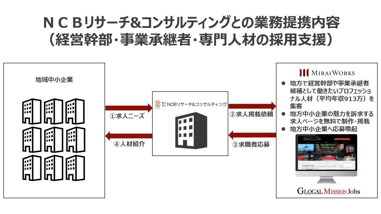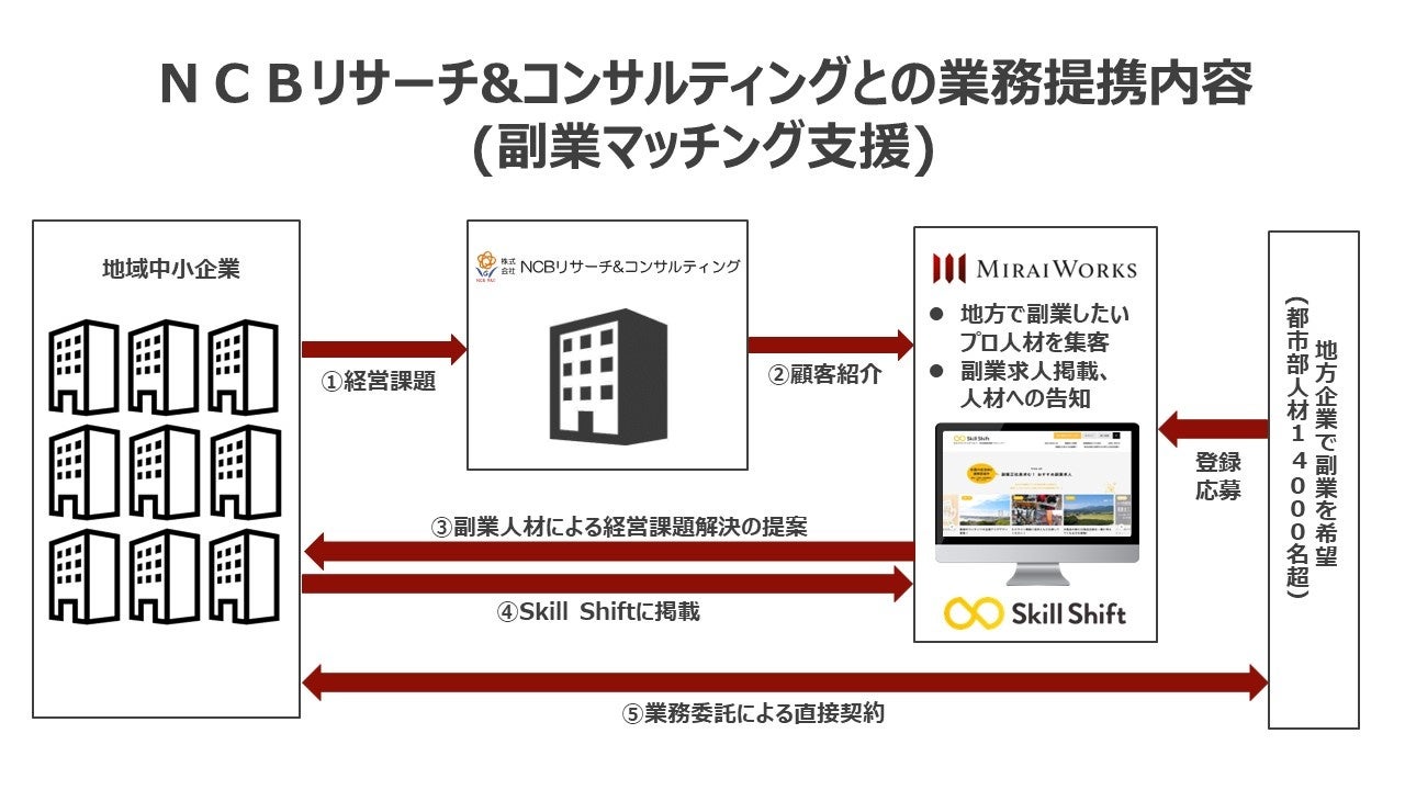 今回、新たな施策として、『Glocal Mission Jobs(GMJ)』と『Skill Shift』と連携することにより、自らのスキルを地域貢献に活かしたいプロフェッショナル人材と、NCBリサーチ&コンサルティングのお取引企業をマッチングし、NCBリサーチ&コンサルティングのお取引先における人材課題解決の強化を目指します。