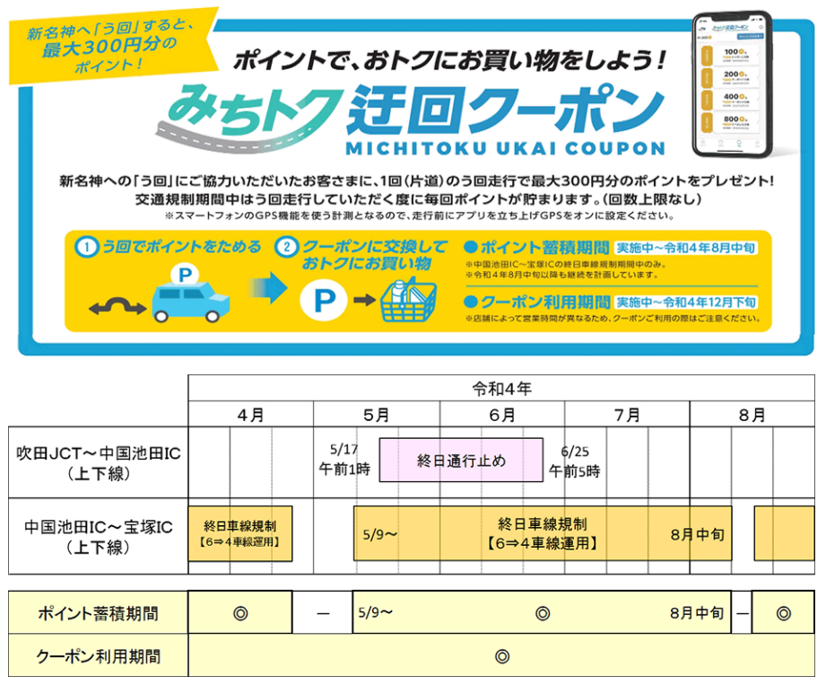 E1A 新名神へのう回にご協力いただいたお客さまに、専用アプリ『みちトク迂回クーポン』を用いたう回キャンペーンを行います。