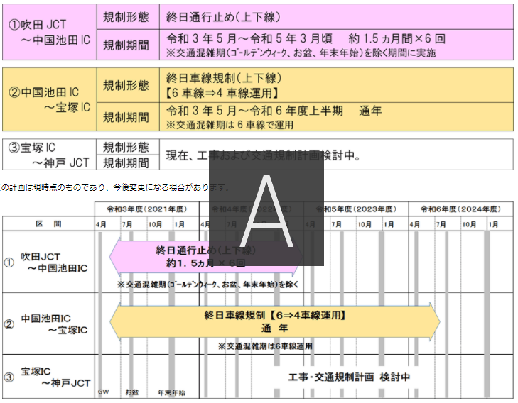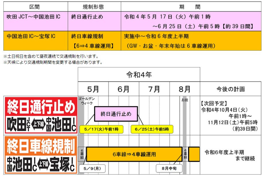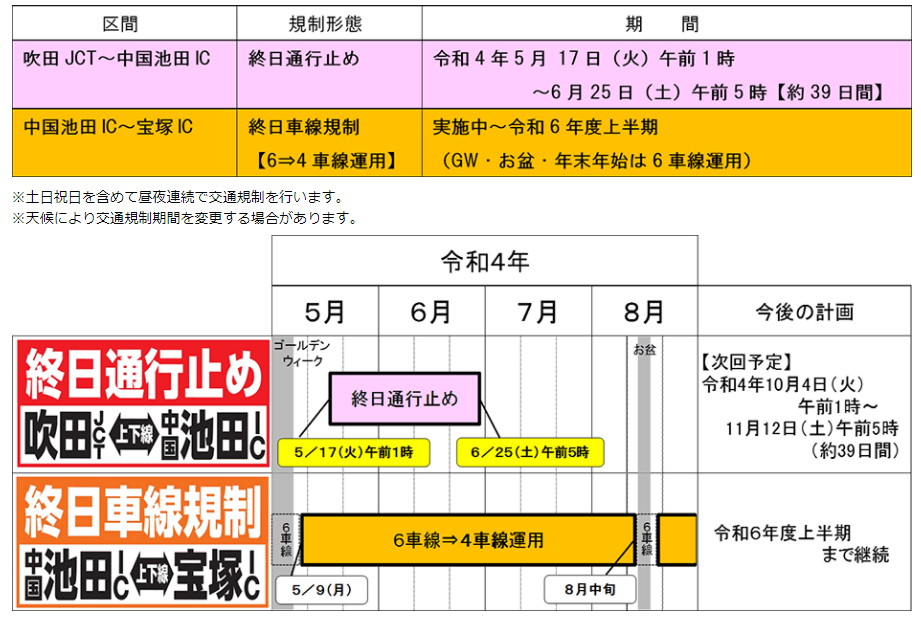 E2A中国自動車道(吹田JCT~宝塚IC)のリニューアル工事 令和4年5~8月の交通規制の日程をお知らせします