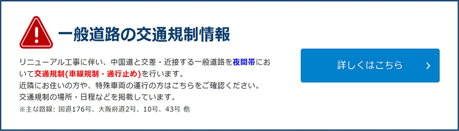 E2A中国道の交通規制期間以外も含めて、高速道路の高架下では足場設置・解体や、新設の桁・床版の組立作業を行っています。これに伴い、安全確保のため、E2A中国道と交差・平行する国道、府道、市道で夜間通行止め等の交通規制を行っています。一般道の交通規制の箇所や時期、う回経路につきましては、「中国道リニューアル工事専用WEBサイト( https://kansai-renewal.com/2021_chugoku/)」に掲載しておりますのでご確認ください。