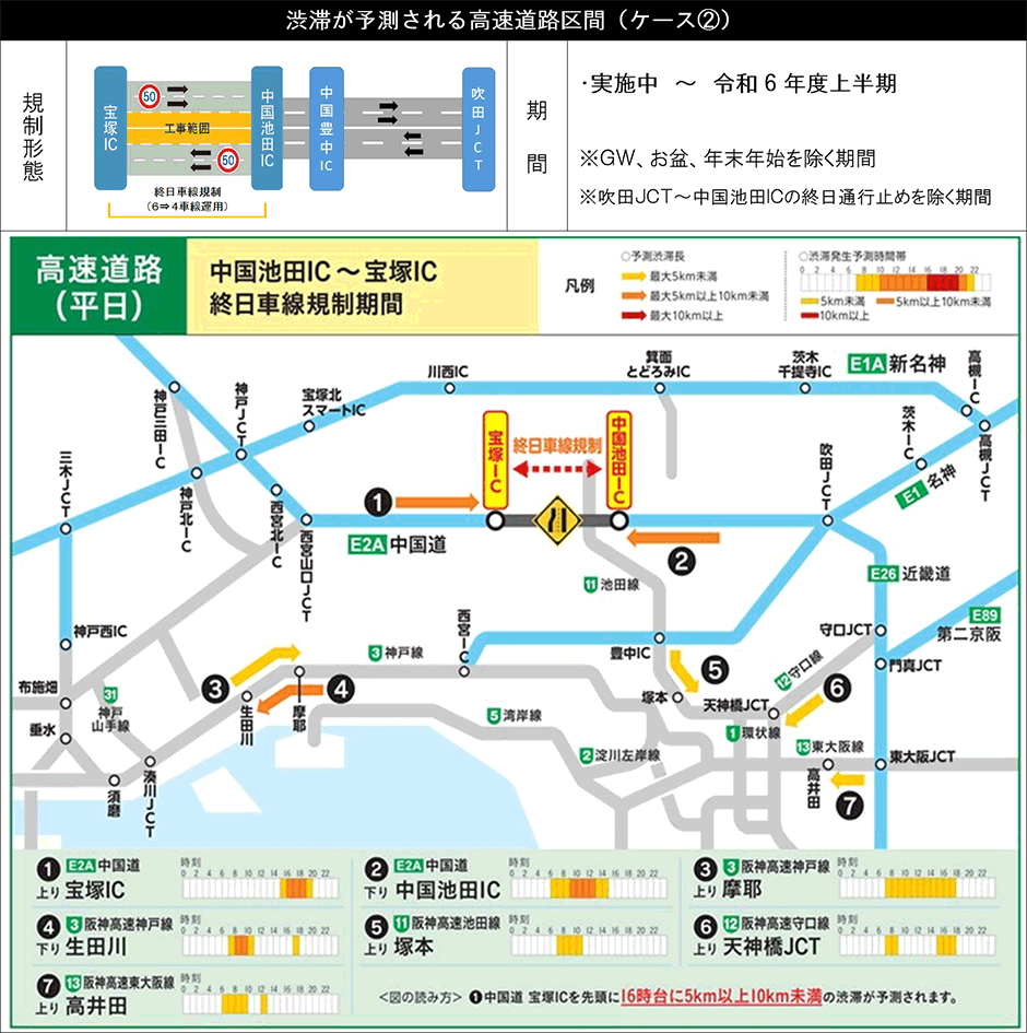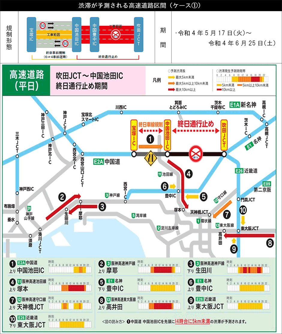 | ※休日も渋滞が予測されております。参考資料12ページをご確認ください。 ※上図の渋滞予測は、中国道 吹田JCT~宝塚ICの交通規制により影響が予測される高速道路の渋滞を示したものであり、それ以外の要因による渋滞は表示しておりません。 ※予測渋滞長は、工事期間中の日最大渋滞長の平均値です。 |