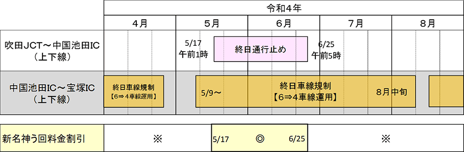 ※中国池田IC~宝塚ICの一部では、夜間の時間帯において、車線運用を変更する場合があります。通行帯が1車線になる箇所がありますので注意してご通行ください。