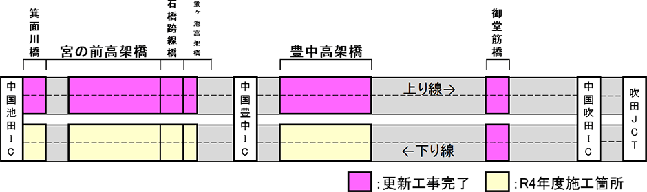 吹田JCT~中国池田IC間 上り線 の橋梁更新工事は令和4年3月12日をもって完了しました。