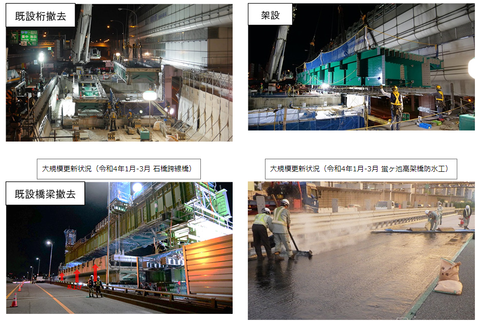 | 大規模更新 | ・橋梁部で老朽化した鋼桁やコンクリート床版を、耐久性に優れた部材に取り替える工事を行います。<3橋(7箇所)で約5,300m2> |