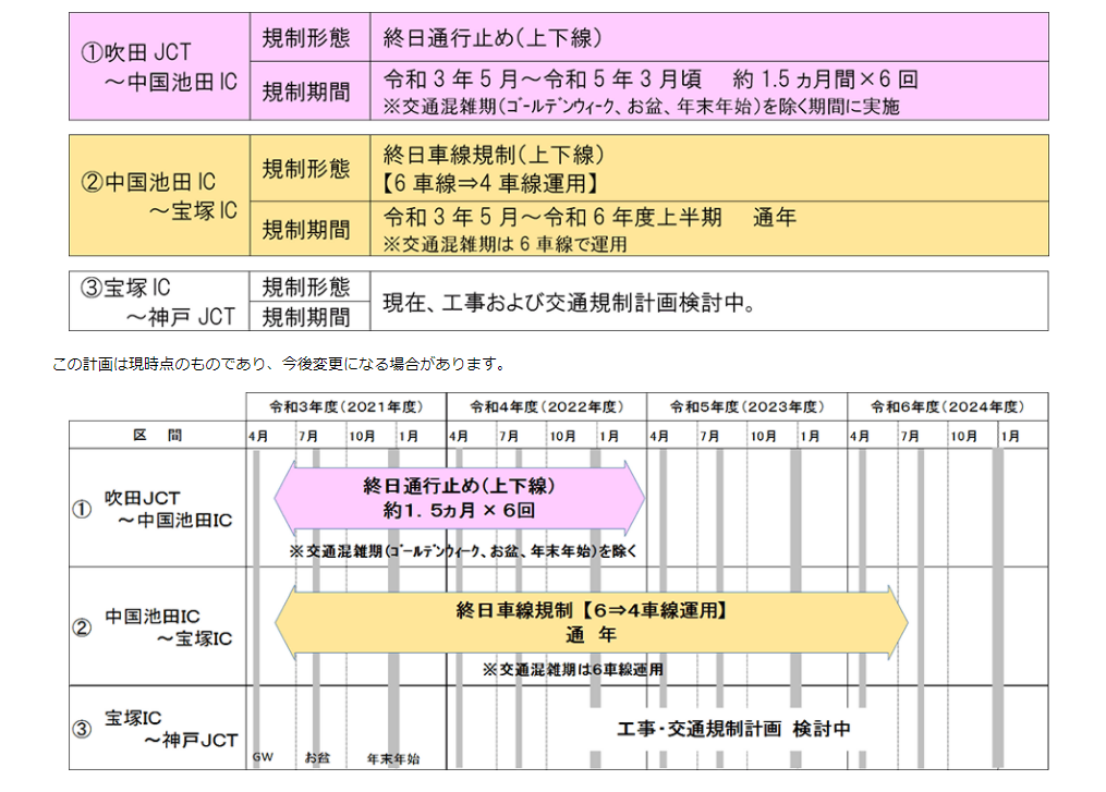 ※中国池田IC~宝塚IC間は車線幅が縮小され最高速度が50km/hとなりますので、速度や車間距離に注意して安全な走行をお願いします。なお、ゴールデンウィーク、お盆、年末年始の交通混雑期は一時的に6車線運用に戻りますが、車線幅の縮小並びに速度規制(最高速度50km/h)は継続します。