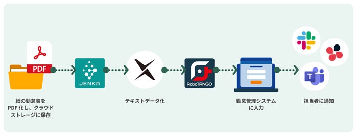 紙の勤怠表を複合機やスキャナでPDF化しクラウドストレージに保存します。その後『DX Suite』で読み取りデータ化し、RPAが勤怠管理システムに登録します。登録が完了したクラウドストレージ内の勤怠表PDFデータは登録完了済のフォルダに移動させ、全社員分完了したらチャットで通知する一連の流れを自動化できます。