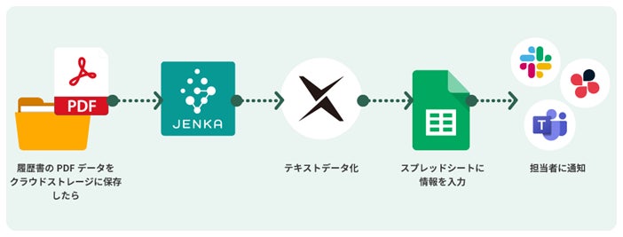 採用の際に応募者が送付してきた履歴書のPDFデータをクラウドストレージに保存し、『DX Suite』で読み取りデータ化し内容をスプレッドシートに入力します。作業完了後、採用担当者にチャットで通知する一連の流れを自動化できます。