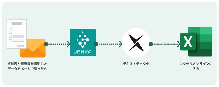 紙の点検表を撮影しメールに添付して送信後、『DX Suite』で読み取りテキストをデータ化、指定のExcelオンラインのシートに内容を入力するという一連の作業が自動化できます。