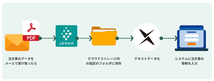 取引先から送付されたPDFの注文書をOneDriveやGoogleDriveなどのクラウドストレージの指定のフォルダに保存し、『DX Suite』で読み取りテキストをデータ化し、kintoneなどのシステムに注文書の取引先名・品名・金額・受け取り日時等の内容の入力作業を自動化できます。さらに、API連携ができない会社独自の基幹システムなどは、RPAを活用して自動登録することができます。