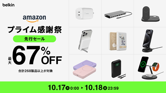 米カリフォルニア発、洗練されたデザインと快適なライフスタイル体験を提案し、グローバルで絶大な人気と市場シェアを誇るスマートフォン・PC関連製品ブランド「Belkin」の日本法人、ベルキン株式会社(以下Belkin、所在地:東京都中央区京橋)は、10月17日(木)〜10月20日(日)(先行セール期間を含め)にて開催されるプライム感謝祭にて、Apple Store取扱されたQi2ワイヤレス充電器、iPhone 16対応保護フィルム、ドッキングステーションなどの最新製品を中心に、全258製品を最大67%オフのセール価格にて販売いたします。