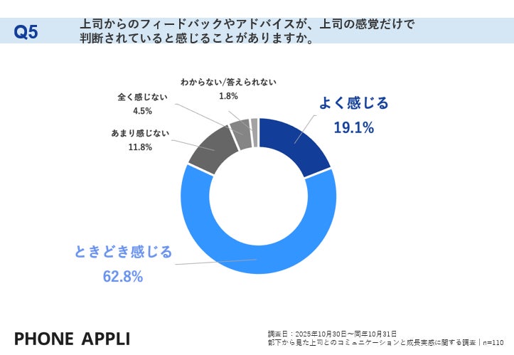 すべての企業をウェルビーイング企業にアップグレードすることを目指す、株式会社PHONE APPLI(本社:東京都港区、代表取締役社長:大林 春彦)は、定期的に上司と1on1やミーティングを実施している企業に勤める一般社員(部下・メンバー層)110名を対象に実施した、「部下から見た上司とのコミュニケーションと成長実感に関する調査」の結果についてお知らせします。