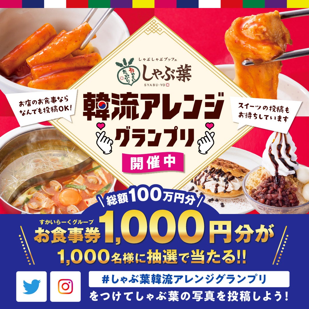 期間中、しゃぶ葉のトッピングを組み合わせたオリジナル鍋やスイーツの画像を「#しゃぶ葉韓流アレンジグランプリ」をつけて、Twitter・Instagramにて投稿すると、抽選で総勢1,000名様に総額100万円分のお食事券が当たるキャンペーンです。さらにTwitter・Instagramそれぞれの投稿からグランプリを各1名選出し、グランプリ受賞者には、1万円分のお食事券をプレゼントします。