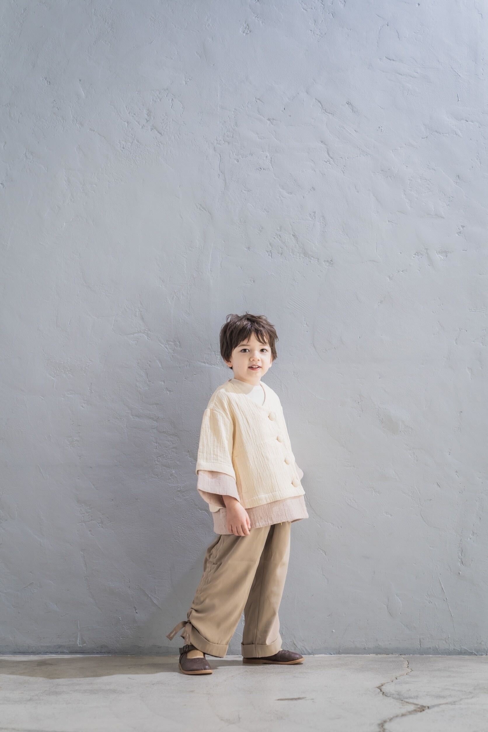 ELMISAのこども服は、トレンドに流されず子供の肌の質感・笑顔など自然な魅力を引き立てるシンプルでナチュラルなトーンでまとめられています。子供の成長に服が合わせられるようアジャスター・絞り紐・ロールアップボタンを配置、生地には汚れにくい特殊な撥水加工を施し、縫製は日本国内工場で1つ1つ丁寧に仕上げられています。