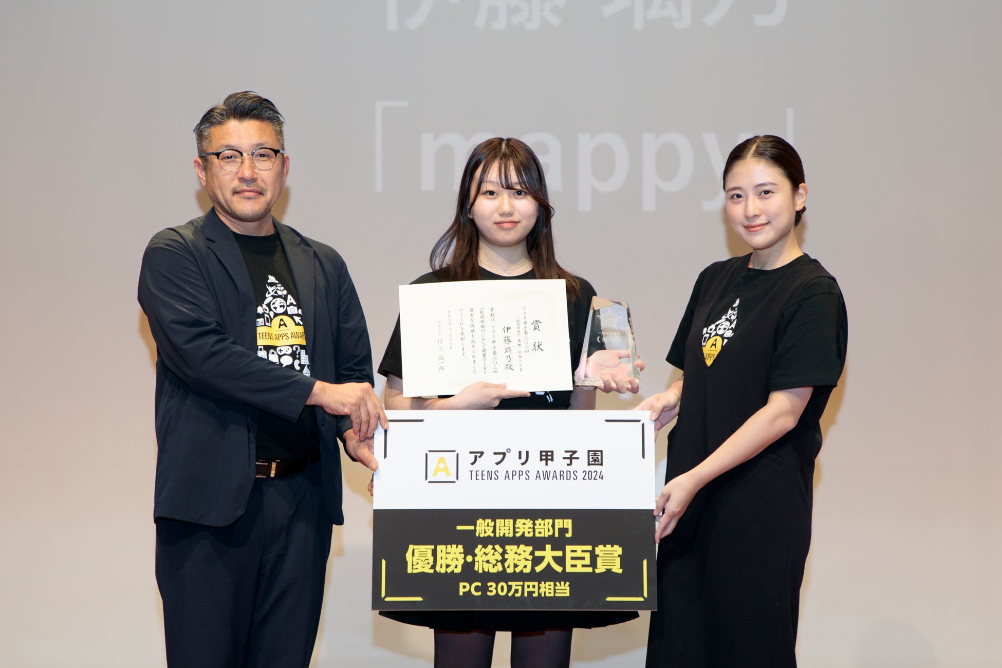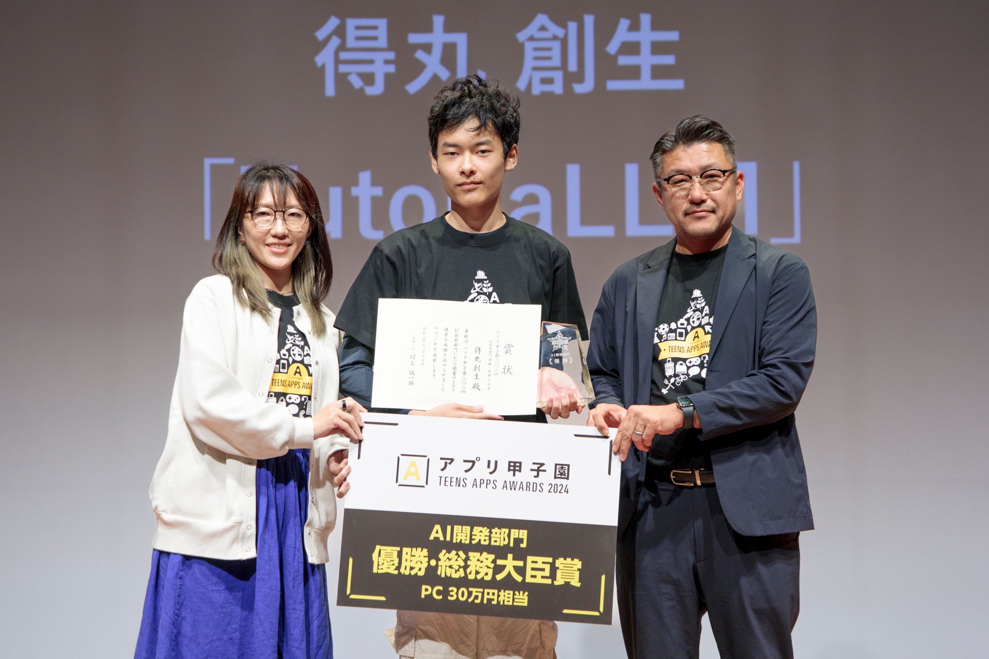 優勝は、一般開発部門 伊藤璃乃さんの新たな思い出記録アプリ「mappy」、AI開発部門 得丸創生さんの子ども向けプログラミング学習サービス「TutoriaLLM」