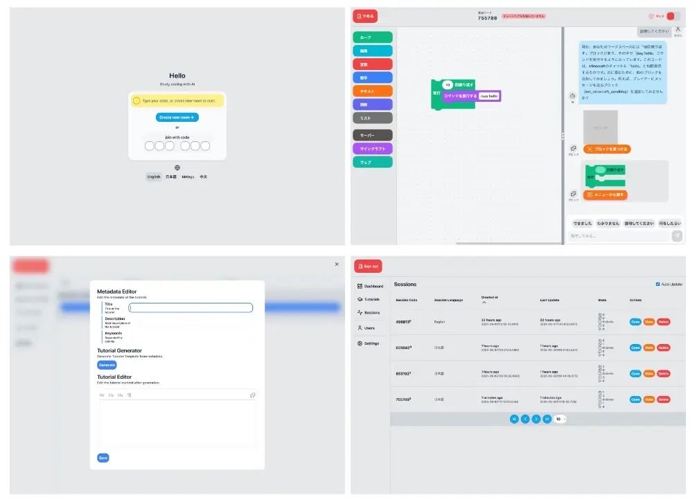 「TutoriaLLM」は、AIがユーザーの行動に反応し、先生のようにチュートリアルに基づいたプログラミング指導を実現。子どもたちが自ら考え、試行錯誤しながらプログラミングの概念を身につけていけるよう設計されています。