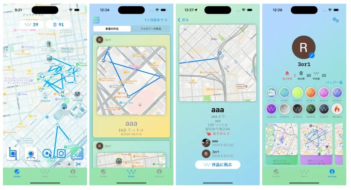 「TrashTrace」は町を自発的に清掃する人向けのSNSアプリ。清掃者は清掃した場所でゴミの写真をとることで、地図上に点を打ち、消えない線を描いていくことができます。それを地上絵として投稿し、清掃者間でありがとうを送りあったり、作品を作ることでミッション達成バッジを得たりすることができ、清掃を続けたいと思える手助けをします。
