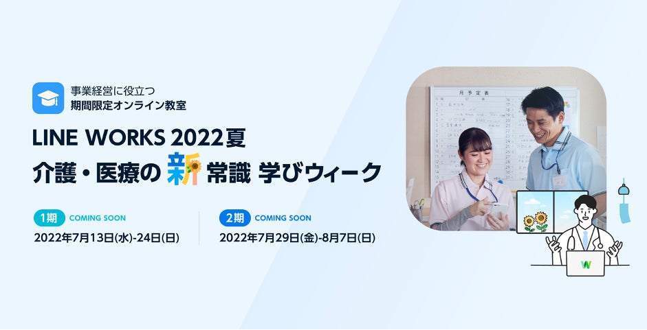 はたらく現場のコミュニケーションツール「LINE WORKS」を提供するワークスモバイルジャパン株式会社(本社:東京都渋谷区、代表取締役社長:増田 隆一、以下 ワークスモバイルジャパン)は、介護・医療事業経営に携わる方向けに、介護・医療経営にまつわるICT活用やBCP(事業継続計画)対策などをご紹介するオンラインカンファレンス「LINE WORKS 2022夏 介護・医療の新常識 学びウィーク」を2期に分けて開催いたします。