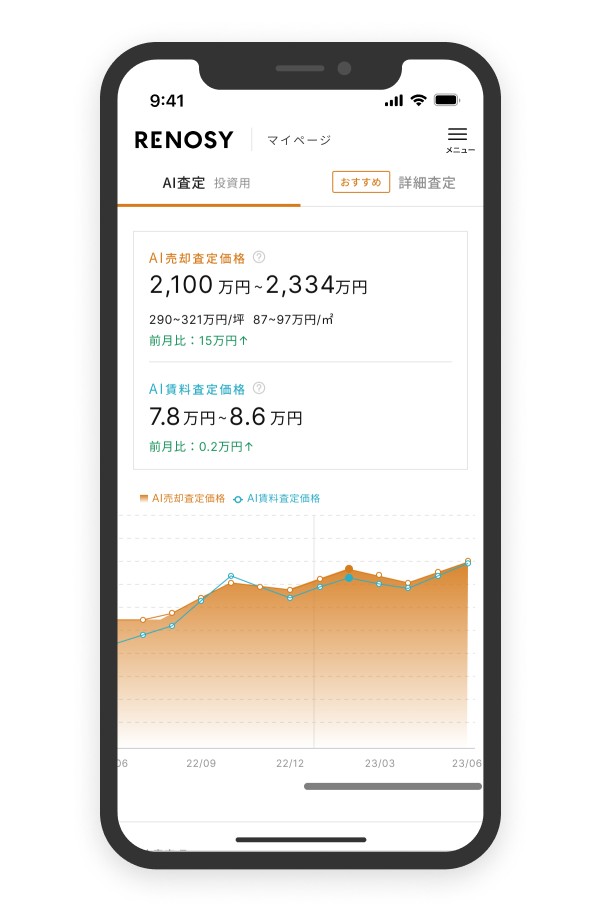 物件を所有するお客様向けにRENOSYのマイページ上で、AIが予測した推定賃料に連動した収益還元法で算出した不動産(※2)の査定価格を確認できる機能です。これによりRENOSYマイページは、居住⽬的で所有する物件と投資⽬的で所有する物件の査定価格を区別し、より正確な概算価格を提供することでお客様のニーズにお応えします。