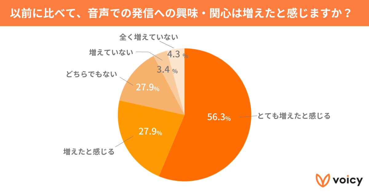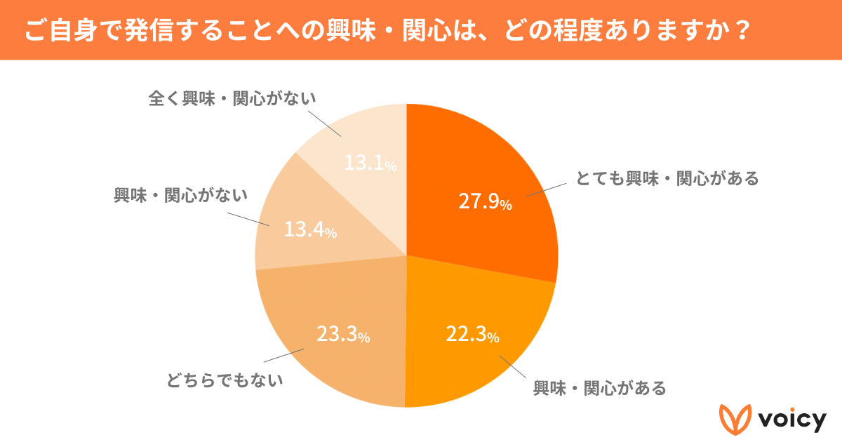 株式会社Voicyが運営する音声プラットフォームVoicyは、Voicyのユーザー1,162名を対象に、発信活動への関心度調査を実施しました。今回の調査で、半数の人が自分自身で発信することに興味・関心があることがわかりました。また、約8割の人が以前に比べ音声発信への興味が増え、2023年新たに始めたい発信方法は、音声配信がブログに次いで2位という結果になりました。音声配信を始めてほしい人、残したかった声ランキングとあわせてお楽しみください。