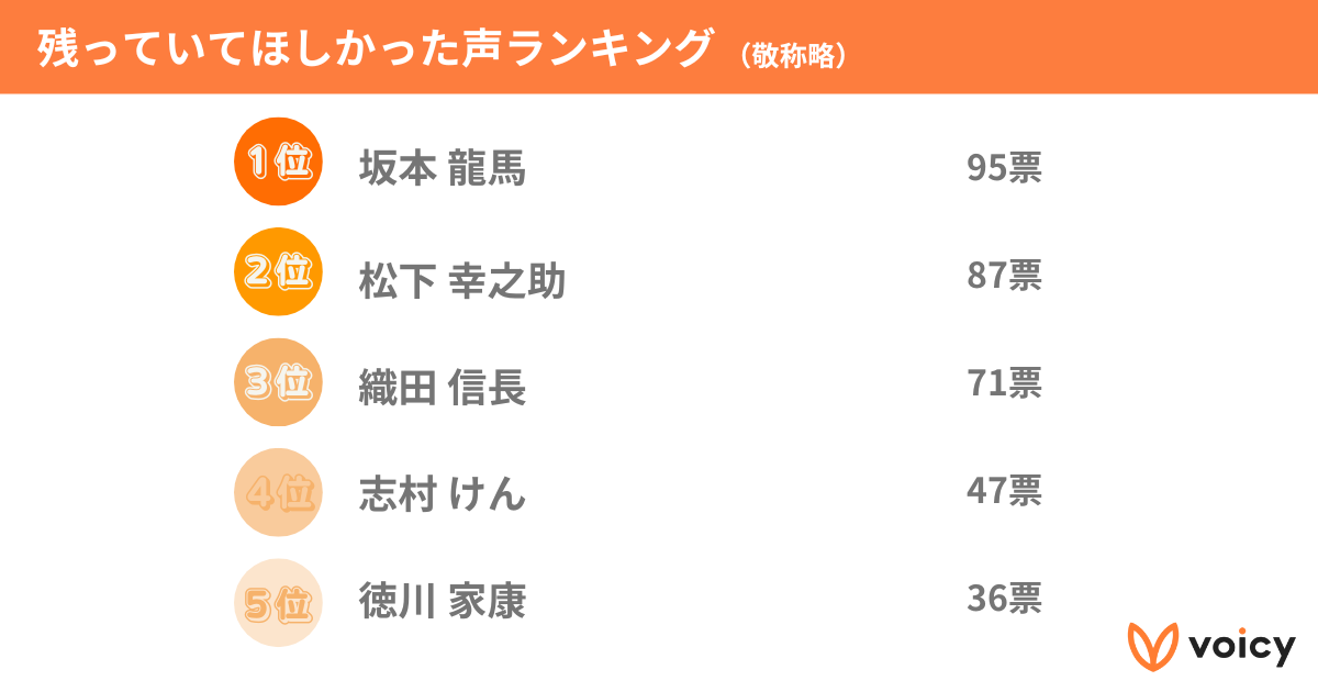 音声配信を始めてほしい人は、1位「成田悠輔」、2位「イチロー」、3位「本田圭佑」。残っていてほしかった声1位は「坂本龍馬」。