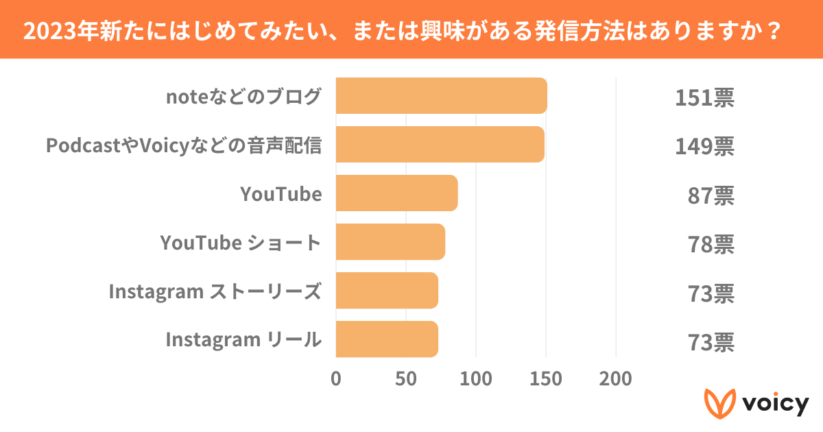 - 2023年新たに始めたい発信方法、音声配信がブログに次いで2位