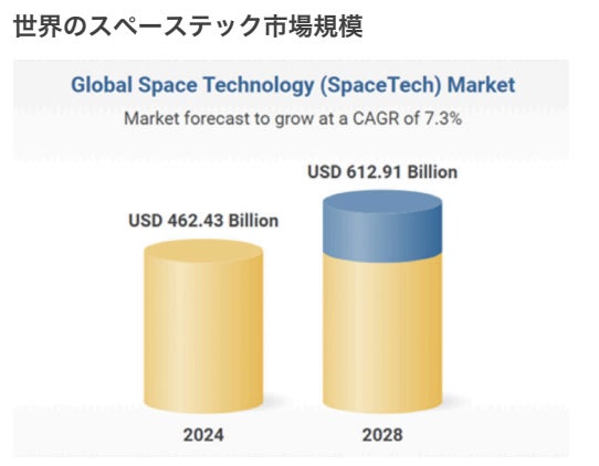 スペーステックの市場は近年、急速な成長を続けています。Research&Marketsのレポートによると、世界的な市場規模は2024年の$462.43Bから2028年には$612.91Bへと、年平均成長率(CAGR)7.3%で拡大する見込みです*。この成長は主に、ロケット技術の進歩、推進システムや宇宙状況把握(SSA)技術の発展、衛星コンステレーションや宇宙における研究開発・製造能力の拡大、宇宙データサービスに対する需要の増加などに支えられています。