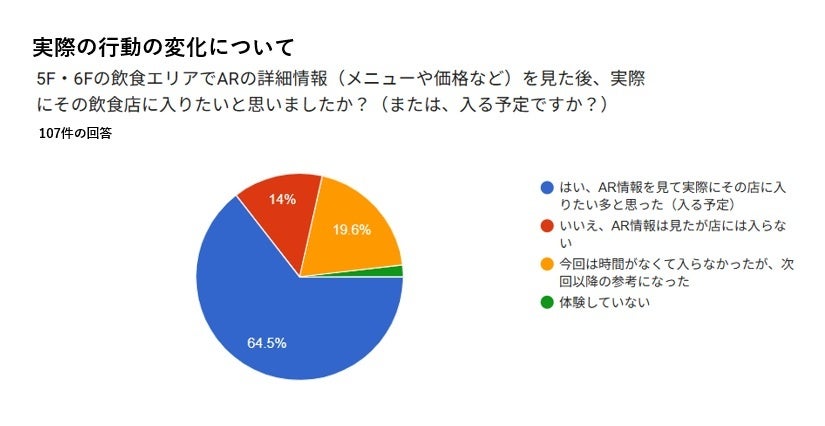 アンケート回答者の65%が「従来のスマートフォン型観光案内よりも良い」または「圧倒的に良い」と評価しました。また、ARで飲食エリアの情報を見た後、84%の参加者が当該飲食店への関心を示し、うち65%が実際に入店への意欲を示す回答をしました。スマートグラスによるAR体験がデジタルと現実を融合した新たな観光体験として受け入れられ、施設内の回遊向上、店舗送客効果への寄与を示唆する結果となりました。