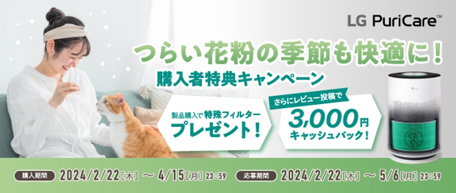 この度のキャンペーンでは、期間内に「LG PuriCare™」シリーズの対象モデルを指定販売店でご購入の上、LG公式サイトで製品登録をし、キャンペーンページよりご応募いただくと、「LG PuriCare™ 特殊フィルター」をプレゼント。さらに、購入製品に関するレビューを投稿いただいた方には、追加で3,000円をキャッシュバックします。応募方法などの詳細は、キャンペーンページをご覧ください。