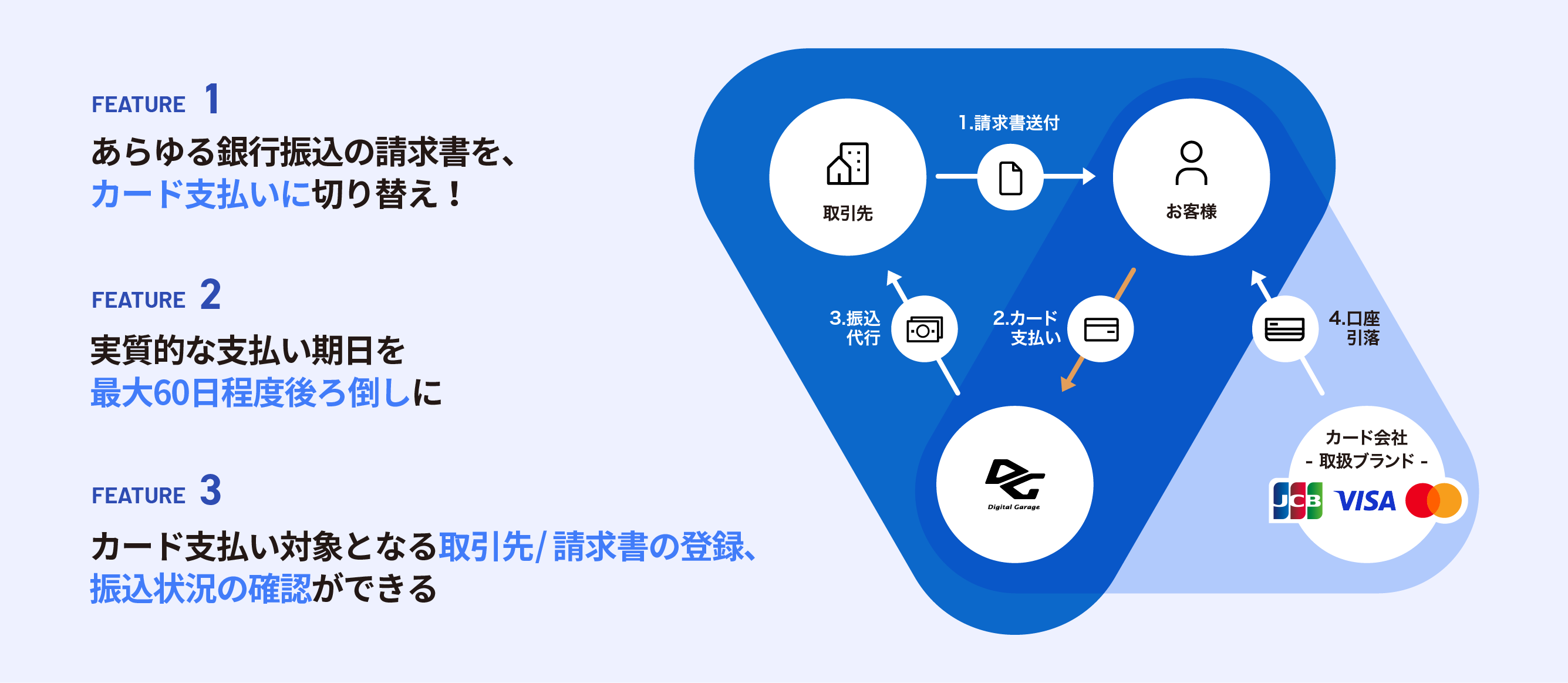 株式会社デジタルガレージ(東証プライム 4819、本社:東京都渋谷区、代表取締役 兼 社長執行役員グループCEO:林 郁、以下:DG)は、B2B向け決済サービス「DGFT請求書カード払い(https://lp.dginvoice.jp/)」が、JCBに加えてVisa、Mastercard®のカード*1に対応したことをお知らせします。本サービスは、銀行振込の請求書をカード払いに切り替えることで、実質的な支払い期日を繰延するサービスです。本年11月に、DGと株式会社ジェーシービーによるB2B向けフィンテック金融事業の第一弾として開始しました*2。