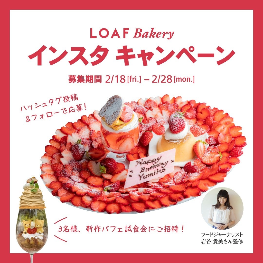 | ■キャンペーン期間:2/18(金)~2/28(月)23:59 まで ※キャンペーンは予告なく開催期間が変更となる場合がございます。 ■ご招待人数:3名様 ■応募資格:ローフベーカリー@loaf.bakery のフォロワー様、Instagramを利用されていて投稿を公開されている方 ■応募方法:@loaf.bakeryのアカウントをフォロー&タグ付けの上、季節限定いちごプレートの写真と合わせてハッシュタグ #ローフベーカリー #LoafBakery #いちごプレート をつけてアップしてください。 ■当選発表:3/3~当選者への連絡は本アカウントからDMにてご連絡差し上げます。 ■選出方法:「季節のいちごプレート」をプロデュースくださったフードジャーナリストの岩谷さんにいちごプレートの良さが伝わる写真を投稿くださった3名を選出いただきます。 ■注意事項: ・非公開アカウントの方は応募の対象外となります。 ・報酬等は発生いたしません。 ・投稿写真は肖像権に抵触しないようご配慮ください(万一問題が発生した場合一切責任を負いません)。 ・企画内容は予告なく変更する場合がございます。 ・選考に関するお問い合わせにはお答えできません。 ・ご当選された方のみ、当アカウントからご連絡いたします。その他アカウントからのご連絡は致しませんので、偽アカウントにご注意くださいませ。