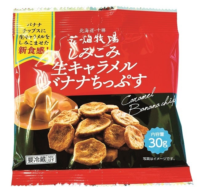 花畑牧場といえば生キャラメル!こちらは生キャラメルをしみこませた新食感のバナナチップスです。