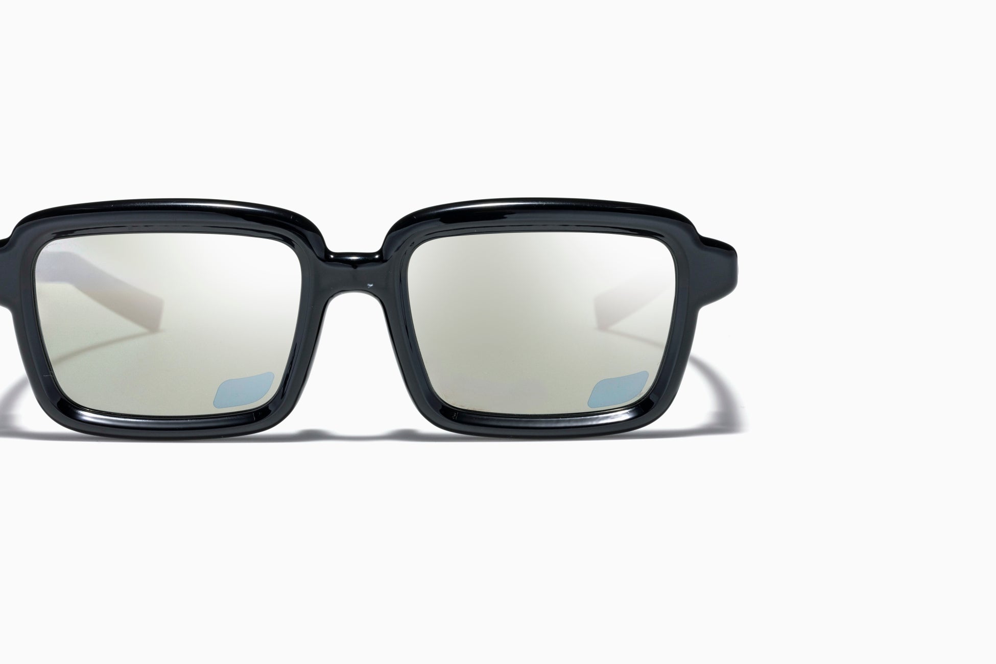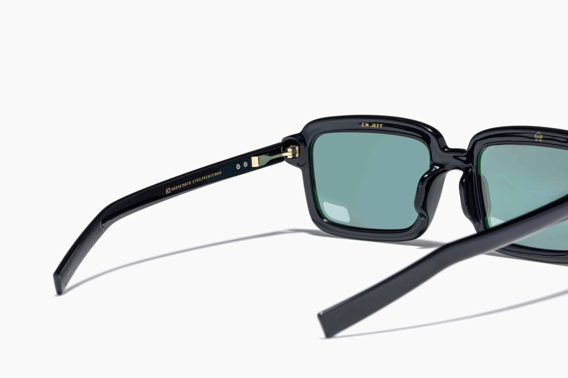 ジェフのメガネをイメージして創り上げたサングラス。フレームは光沢のあるブラックで、丁番やテンプルエンドの『MOTHER2』のロゴはゴールド。クラシカルでオーセンティックな高級感が感じられるデザインです。