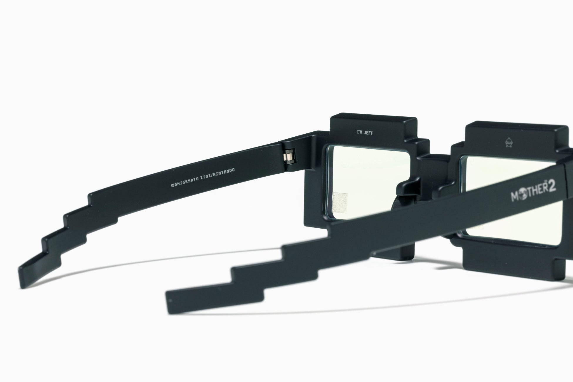 ドット画のジェフのメガネを、極限まで忠実に再現したメガネ。丁番やテンプル前方の『MOTHER2』のロゴはクールな印象のシルバー。テンプルはドット画のギザギザによるユニークなデザインで、マット加工によりゲームのアイテムっぽさを演出。