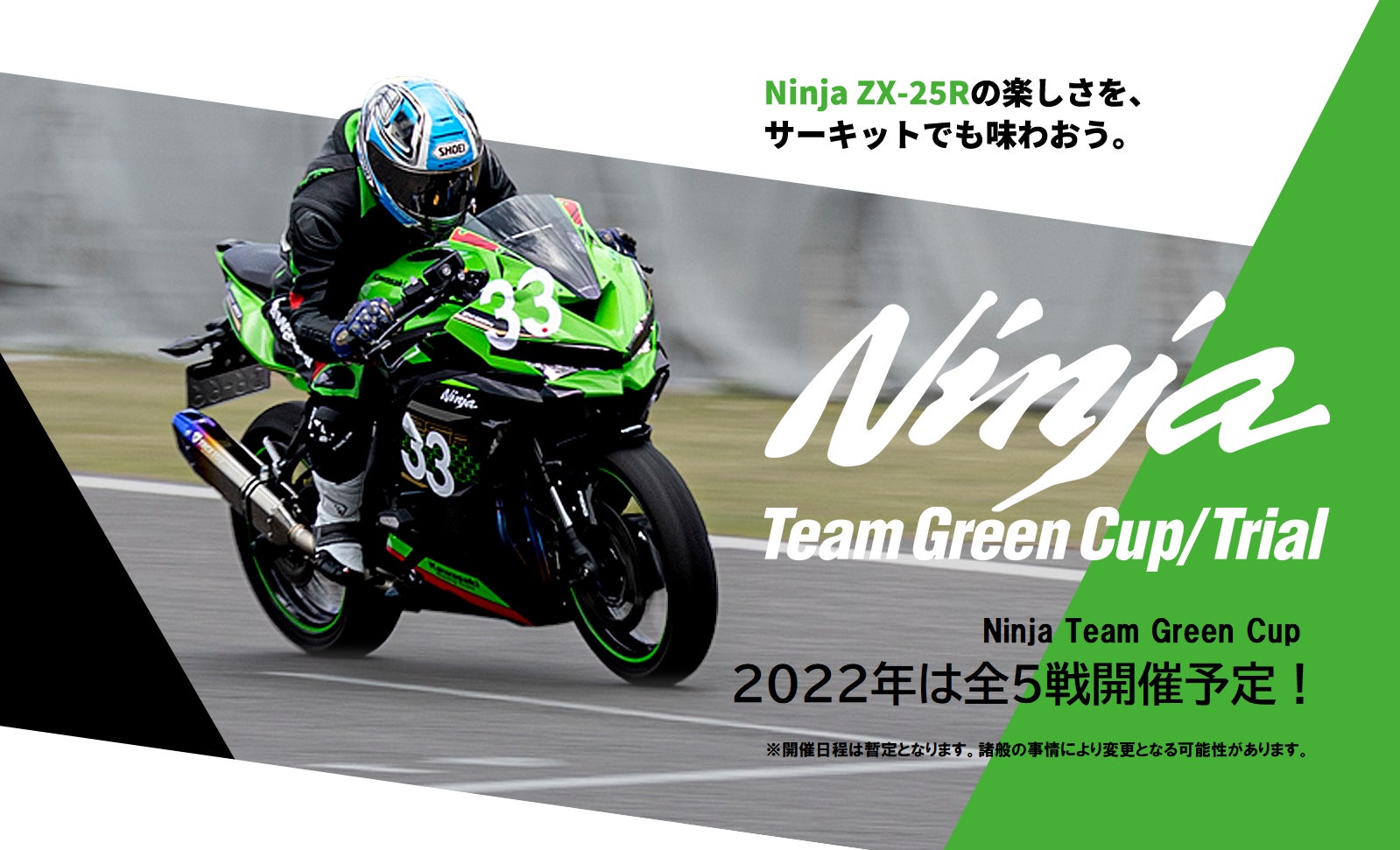 株式会社カワサキモータースジャパン(本社:兵庫県明石市、代表取締役社長:桐野 英子)は、2021年に多くのレースエントリーライダーにお楽しみいただいたNinja Team Green Cupを2022年開催サーキットを増やし実施いたします。