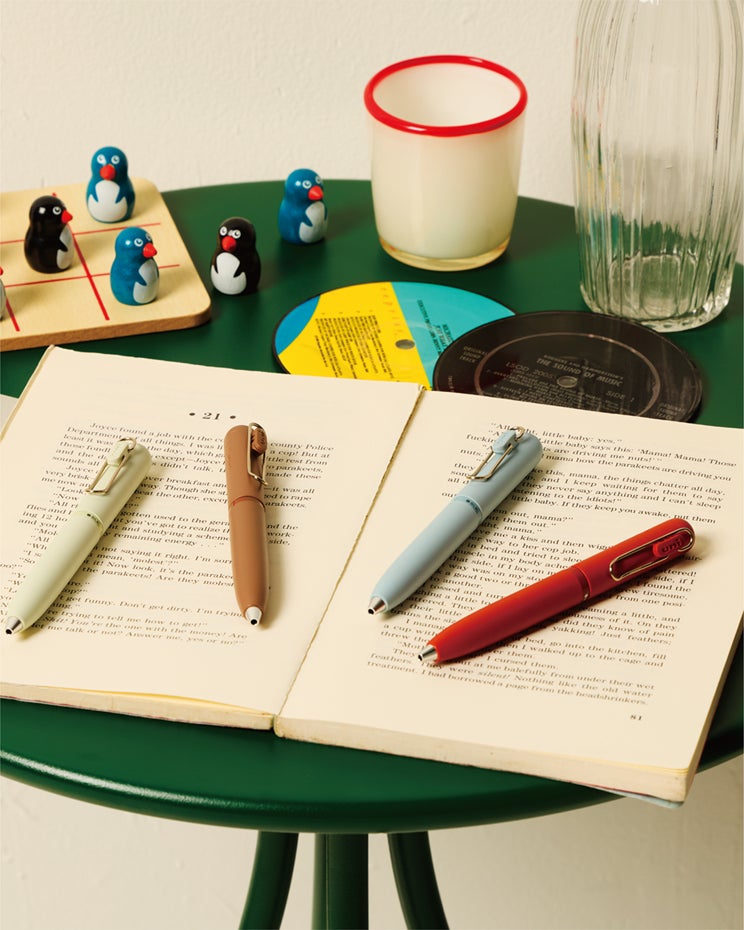 黒、赤、青のスタンダードな3色を搭載し、シンプルでストレートな回転繰り出し式のボディで、手帳に合わせて使うなど持ち運びもしやすい1本となっております。丸みを帯びた短寸軸と重心を最適化する「スタビライザー機構」を採用しており、愛着の湧くデザインでありながら、安定した筆記を実現しております。