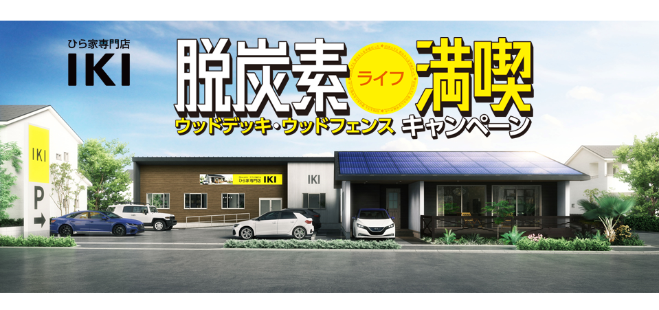 ケイアイスター不動産株式会社(本社/埼玉県本庄市、代表取締役/塙 圭二、以下「当社」と言う。)のグループ会社Casa robotics株式会社(本社/群馬県高崎市、代表取締役/細谷 竜一、以下「カーザロボティクス」と言う。)は、2022年4月29日より、「IKI(イキ)GW脱炭素ライフ満喫!ウッドデッキ・ウッドフェンスキャンペーン」を開始しました。キャンペーン期間中に、規格型平屋注文住宅IKI(イキ)(以下「IKI」と言う。)のご発注を頂いた方で、一定の条件を満たされたお客様に、ウッドデッキ最大2畳分またはウッドフェンス最長5m分をプレゼント(※1)します。