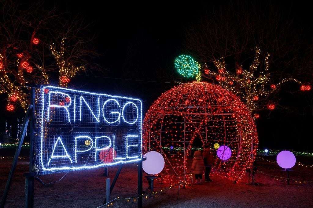 今年のテーマは「光輝く機関車の旅」。入口すぐには「光の機関車」が登場!10m×2mの機関車は迫力満点。客席に乗って写真を撮ることができ、タッチすると汽笛の音がする仕掛けもあります。また、展望テラスからの全景や、リンゴのオブジェなど園内各所にはいろいろな仕掛けを楽しんで頂けます。当公園のイルミネーションは、北アルプスの麓の自然豊かなエリアにあり、空気が澄んでいて光が鮮やかできれいだと好評です。