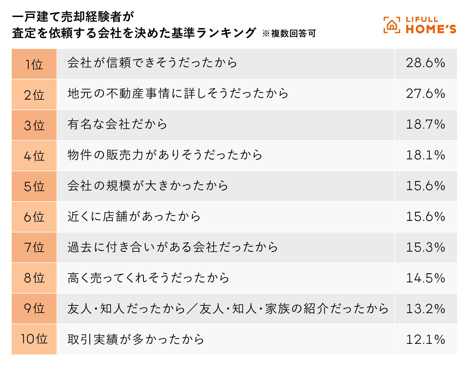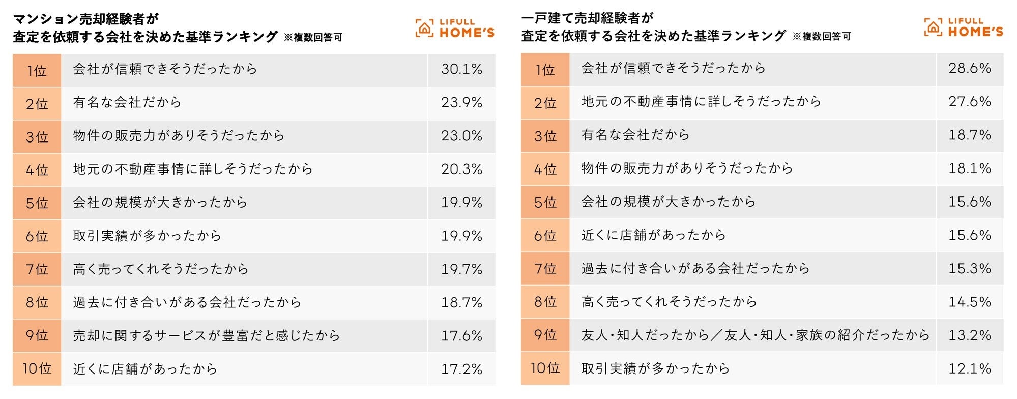 LIFULLが独自に行った調査(※3)では、売却経験者が「査定を依頼する不動産会社を決めた基準」において「会社が信頼できそうだったから」がマンション、一戸建てのどちらの売却時においても「有名な会社だから」を上回っています。