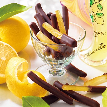 糖漬けしたイタリア産レモンピールをイタリア産のレモンリキュール・リモンチェッロで香りづけし、甘さ控えめのチョコレートでコーティングしました。レモンピールのさわやかな香りがカカオのビターな風味と絶妙に調和します。