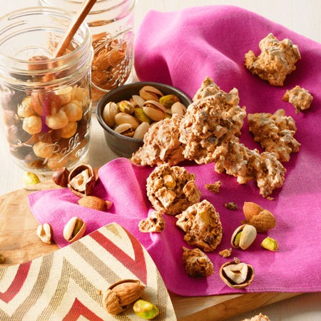 風味豊かなピスタチオ、アーモンド、ヘーゼルナッツをざっくりと砕き、メレンゲと合わせてひと口サイズに焼き上げました。ひと口食べるとザクザクとした食感とともにナッツの風味が口いっぱいに広がるナッツづくしのお菓子です。